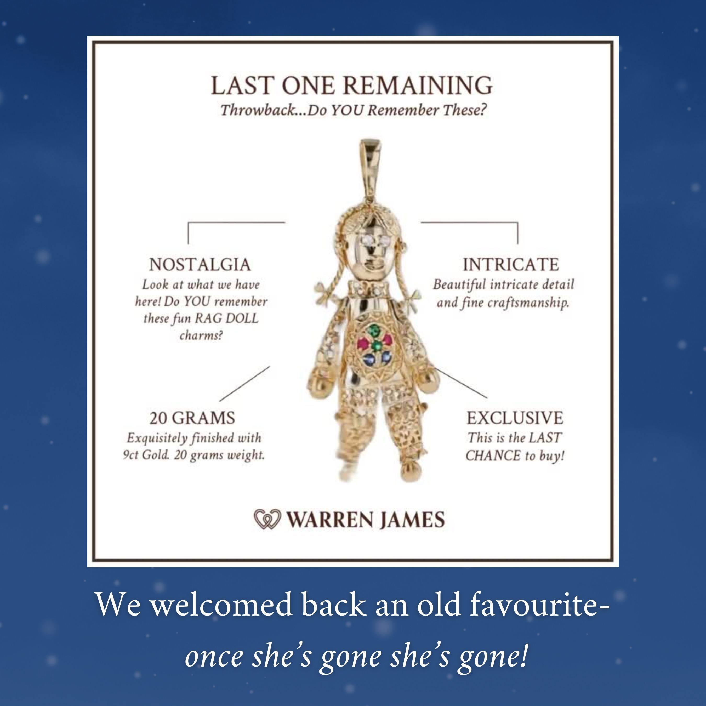 A little throwback that stole hearts all over again! Our 9ct Gold Heavyweight Rag Doll Pendant - Extra Large made a nostalgic comeback, bringing with her memories, meaning and timeless charm. Loved just as much now as then - and with only one left, it's a rare piece of jewellery history waiting to be treasured.