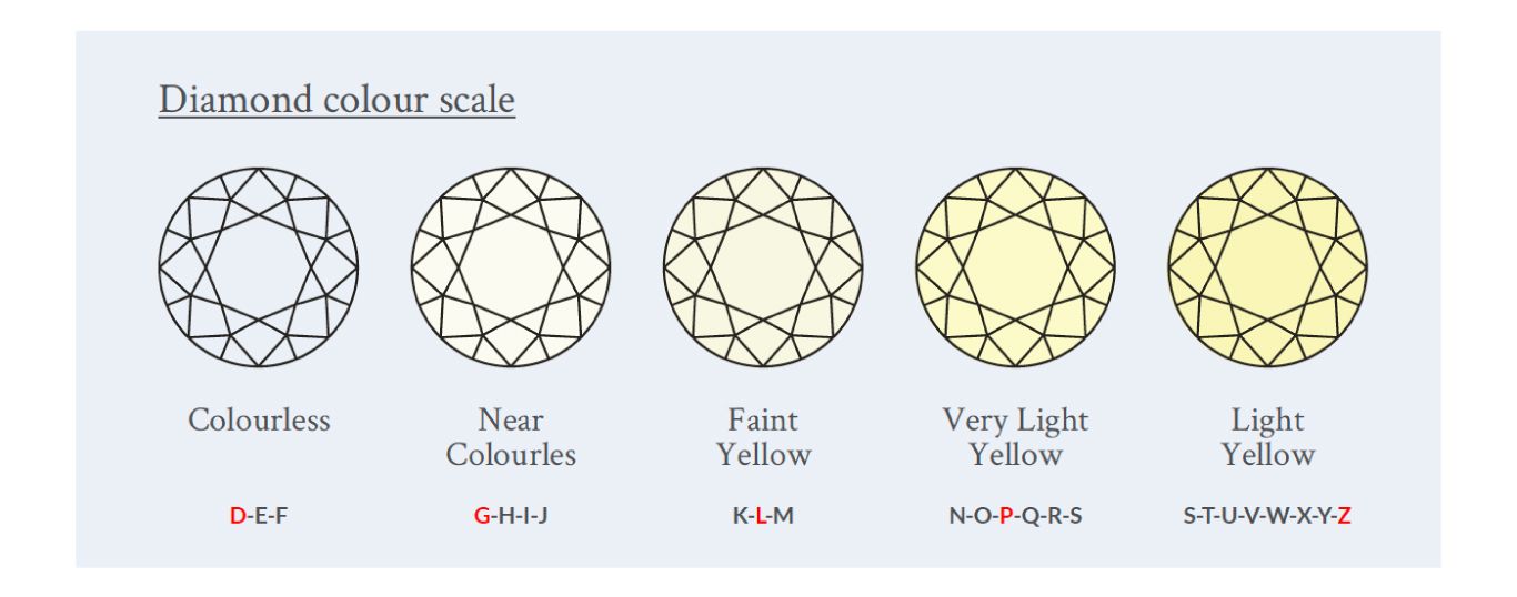 Diamonds are graded against a colour scale that measures them from transparent through to yellow, with poorer quality diamonds having an obvious yellow tint, that can even be seen with the naked eye. The diamond colour scale ranges from D through to Z (nobody´s really knows what happened to A, B and C). With the best colour grade a diamond can have being D which indicates that it is colourless, and the worst being Z, indicating that the stone is very yellow in colour. If you are looking at a solitaire diamond that weighs under 0.50 carat, then choosing colour grade H is a good option. As it is within the white colour range and the naked eye can´t detect any yellow in it. Making it an affordable and great value diamond colour.