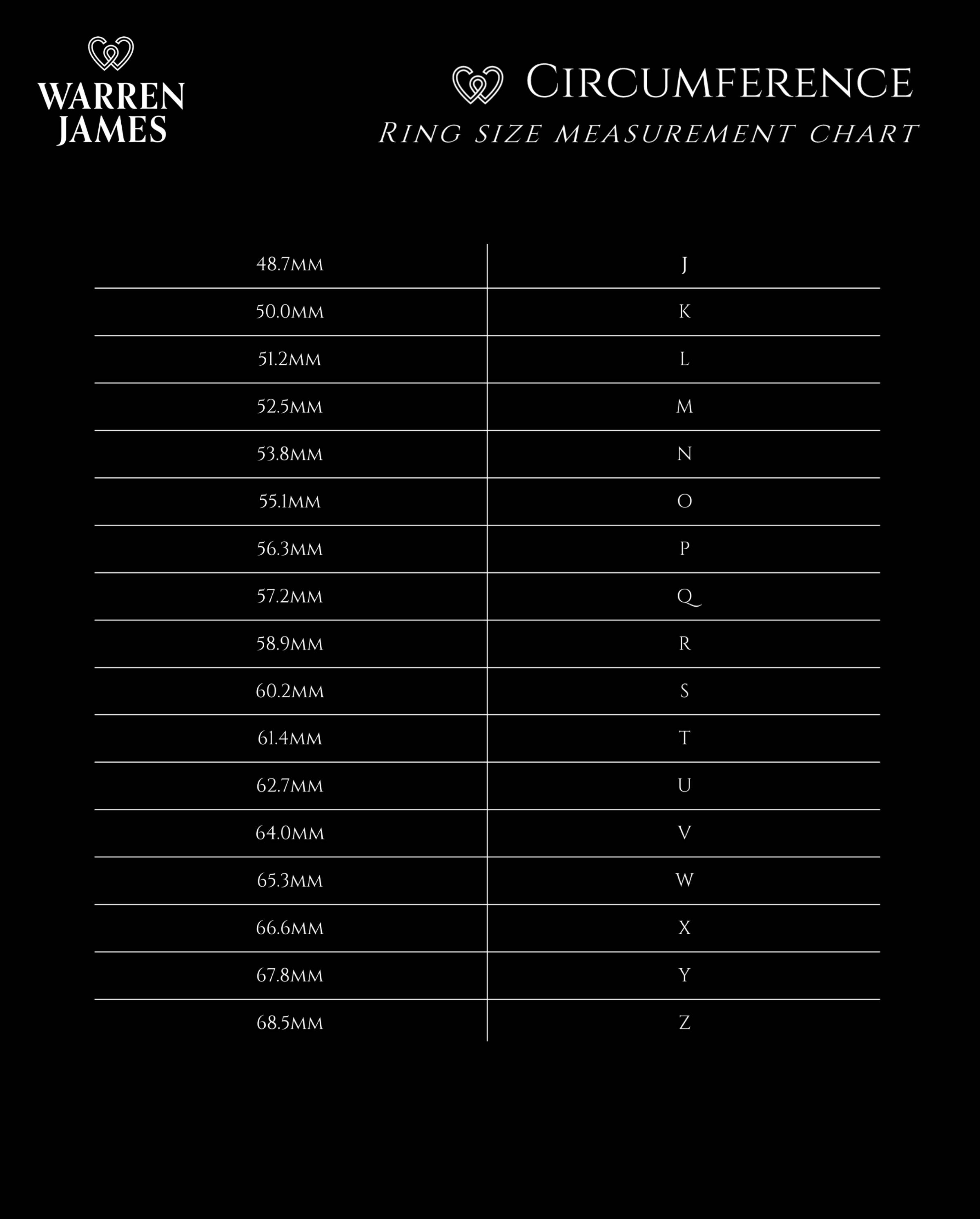 Circumference - If you don’t have an existing ring, you can measure by wrapping a small strip of paper or string around your finger, marking the overlap/join and then measuring this flat strip. You can then check this measurement against the Circumference chart below.